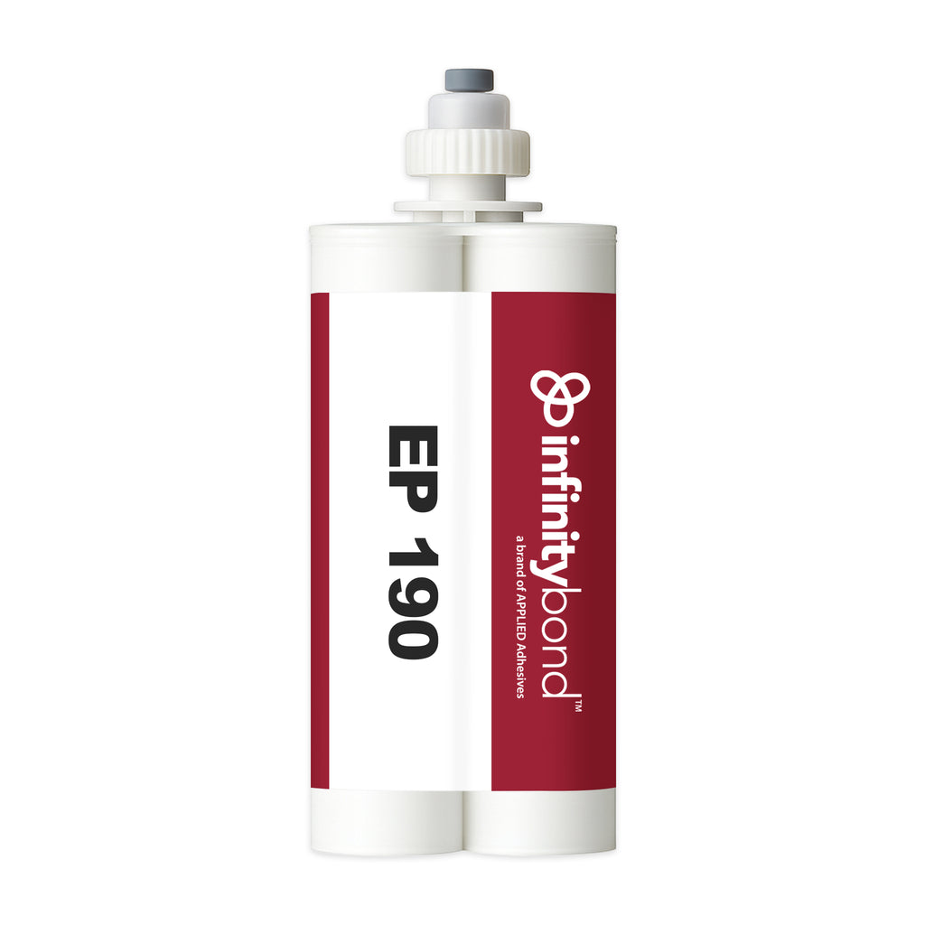 The Infinity Bond EP190 epoxy adhesive offers a long work time (around 80 minutes) and tremendous bond strength to a wide range of substrates. The EP190 Epoxy offers a great bond to plastics as well as metals, woods and more. Each cartridge comes with 2 static mixing nozzles for efficient dispensing.